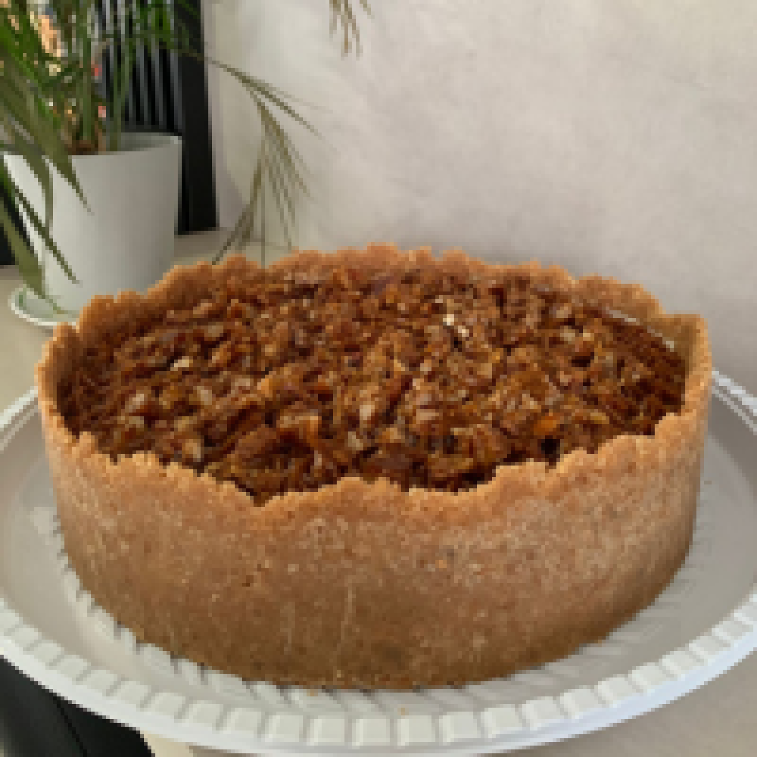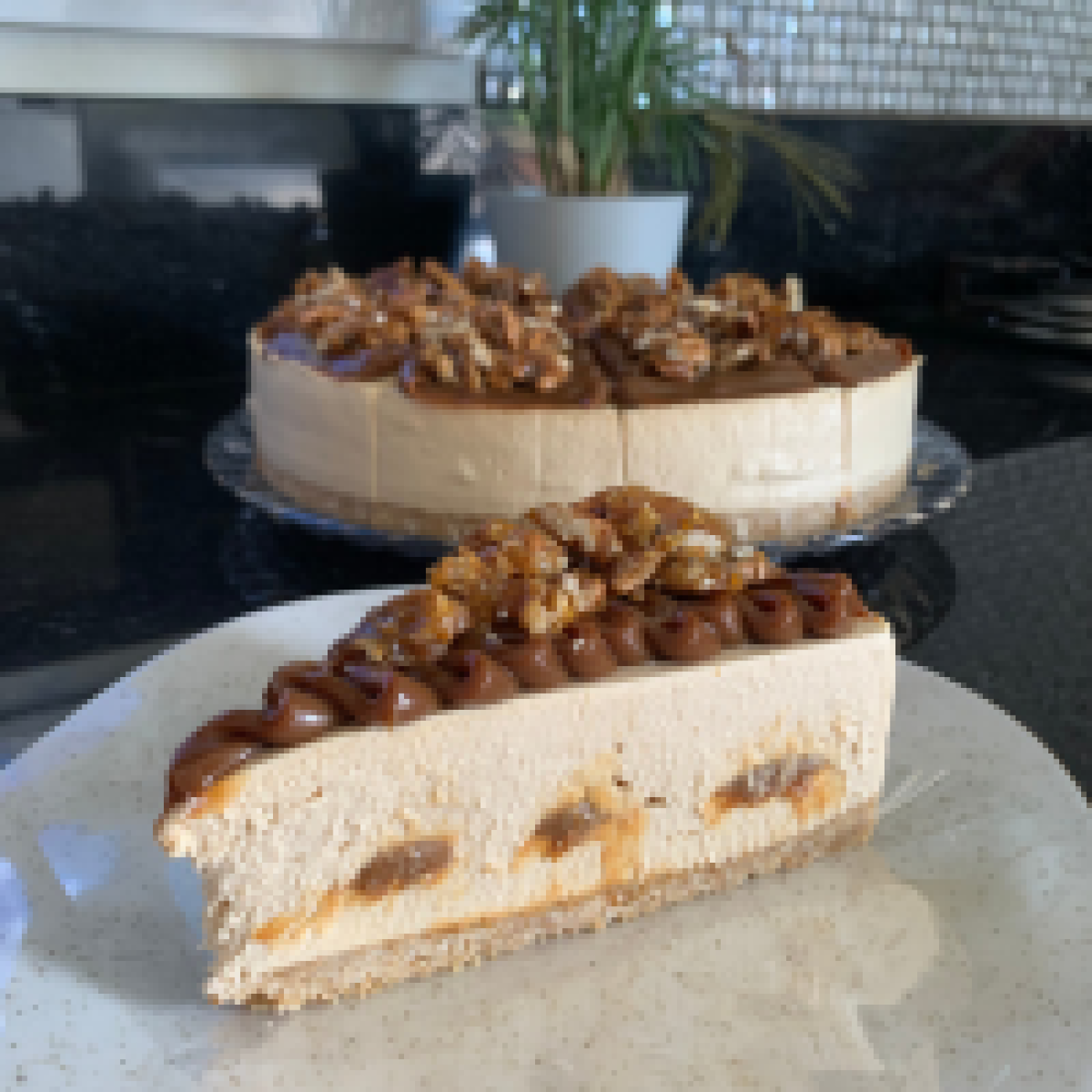 Esta torta apresenta um recheio generoso de mousse de doce de leite, com uma textura aveludada e leve, sobre uma base de biscoito. A experiência se completa com uma cobertura de doce de leite puro, finalizada com nozes selecionadas e crocantes, criando o contraste perfeito entre a cremosidade do mousse e o toque amendoado das castanhas.